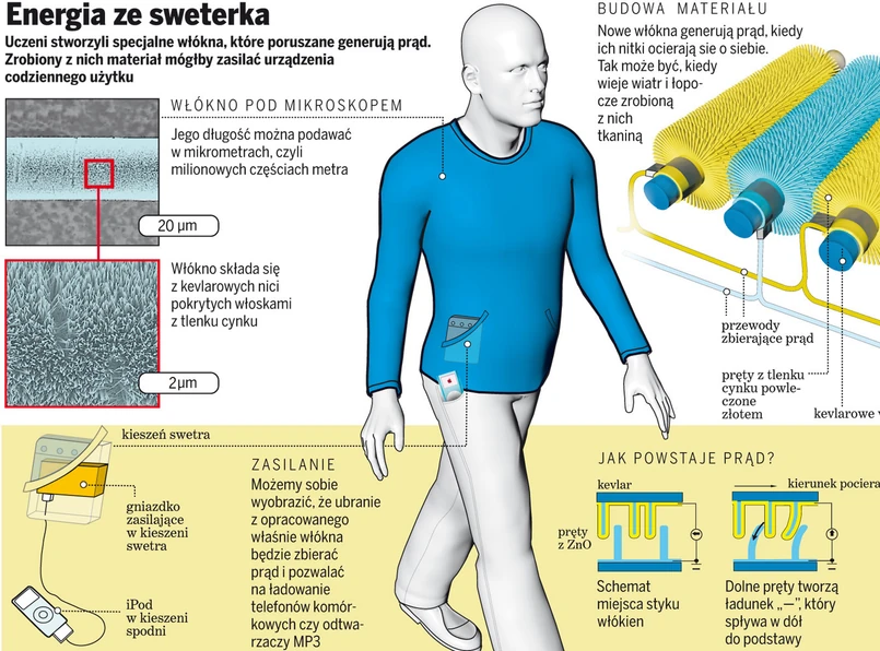 Najnowszy numer prestiżowego tygodnika "Nature" donosi o niezwykłym wynalazku trójki naukowców z Georgia Tech Institute. Uczeni ci stworzyli mikrogeneratory prądu w formie… nici. Zrobiony z nich materiał jest w stanie wykorzystywać energie powstającą podczas ruchu tkaniny.