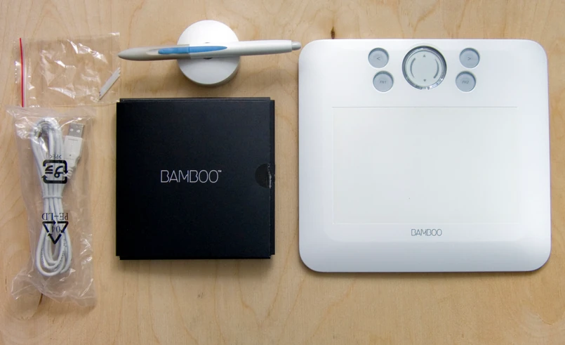 W skład Bamboo Fun wchodzi tablet podłączany do komputera lub klawiatury za pośrednictwem kabla USB, piórko, podstawka oraz płyty - ze sterownikami, oprogramowaniem Adobe Photoshop Elements (wersja na komputer PC oraz Mac) oraz z programem do malowania ArtRage2.