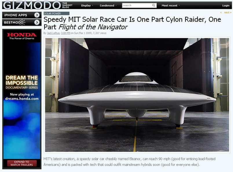 Niezwykle szybki wóz zasilany słońcem pokazali właśnie inżynierowie z Massachusetts Institute of Technology. Samochodzik o futurystycznym wyglądzie i smukłych kształtach nazwano słodko Eleonor (takie przezwisko nosił też najbardziej pożądany samochód w filmie „60 sekund” z Nicholasem Cage’em). Przypominająca latający spodek ze starego filmu Eleanor jest w stanie rozpędzić się do 150 km/h.