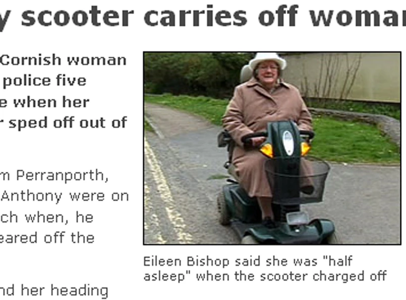 Ponieważ starsza pani ma już problemy z chodzeniem, poruszała się na elektrycznym skuterku. "Nagle, ni z tego, ni z owego, żona wyprzedziła mnie na pełnym gazie, a skuter powiózł ją wzdłuż drogi" - opowiadał Anthony Bishop w wywiadzie dla BBC. Choć mąż krzyczał za uprowadzoną przez maszynę kobietą, ta go chyba nie słyszała (jak dodaje Anthony, Eileen ma już problemy ze słyszeniem). "Ja sam nie mogłem się rzucić za nią w pogoń, bo trzy razy przechodziłem zabieg by-passów" - tłumaczy Anthony.
