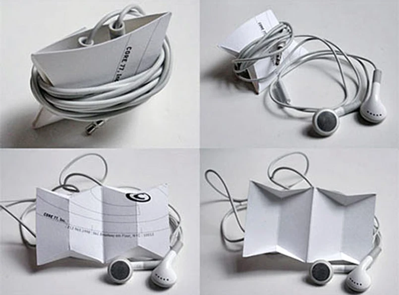 O wiele tańszym, a przy tym oryginalnym wynalazkiem jest szpulka zaprojektowana przez jednego z redaktorów portalu Core77 poświęconego designowi. W ramach konkursu na nietypowe wykorzystanie wizytówki pracownik Core77 zaproponował, by wykonać z niej szpulkę na słuchawki. Słuchawkowe origami sprawdzi się jednocześnie w roli etui na to urządzenie.