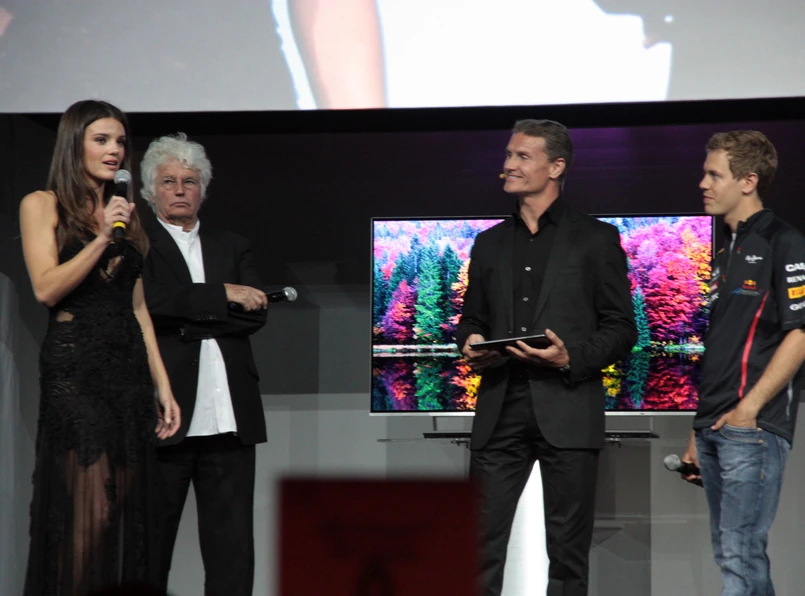 Potem na scenie pojawiły się trzy personifikacje zalet nowego telewizora. Kierowca Formuły 1 Sebastian Vettel, supermodelka Gemma Sanderson oraz reżyser Jean-Jacques Annaud. Vettel miał symbolizować szybkość, Sanderson była przede wszystkim piękna i szczupła, a Jacques-Annaud - dla średnio zorientowanych miłośników kina: autor między innymi hitu filmowego "Siedem lat w Tybecie" - mówił wiele o perfekcji i profesjonalizmie.