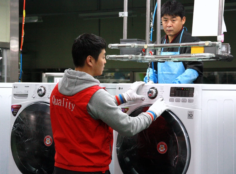 Należąca do koncernu LG fabryka w Changwon pracuje na dwie zmiany. 20 proc. zadań wykonywane jest w niej przez automaty, resztą zajmują się ludzie. Pracownicy uwijają się sprawnie przy stale przesuwającej się taśmie. Na złożenie pralki nie trzeba długo czekać. Około 20 minut zajmuje montaż ładowanej od przodu, mniej więcej 2 minuty krócej trwa produkcja pralki ładowanej od góry.
