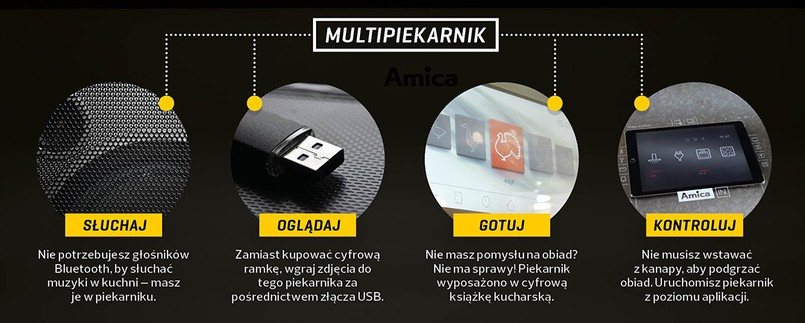 Na koniec zostawiłem najsmaczniejszy kąsek dla czytelników Stuffa– kilka inteligentnych i nietypowych funkcji. Amicę wyposażono w moduł Bluetooth oraz złącze Ethernet do podłączenia internetu. Ale chyba nie myślisz, że są tam po to, aby poprawić smak potraw?
