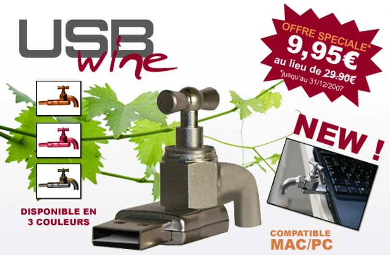 Idealny prezent dla miłośnika win! Zawartość butelki ściągnij z internetu na twardy dysk, a przez kranik usb do kieliszka. Francuzi wiedzą najlepiej, jak postępować z trunkiem bogów. Do tego dają swój kranik w trzech kolorach (metaliczny, winny i pomarańczowy), i to za jedyne 9,95 euro.