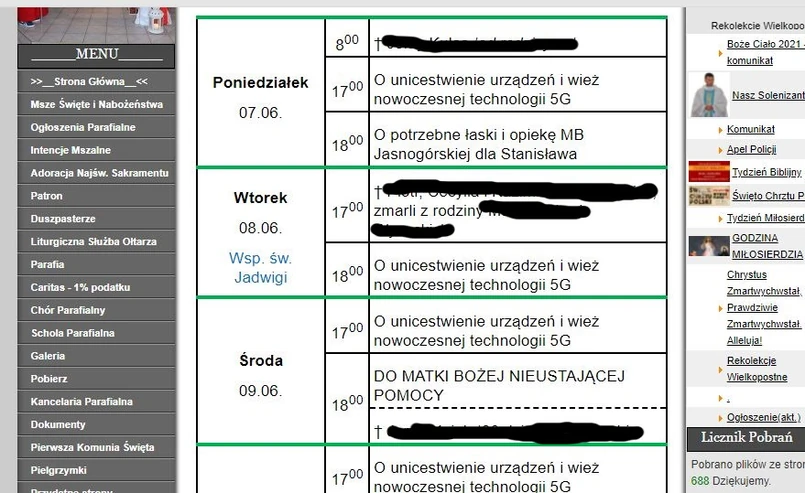 Proboszcz przyznał, że uczestnicy nabożeństw "o unicestwienie urządzeń i wież nowoczesnej technologii 5G" nie reagowali negatywnie, gdy kapłan informował o intencji mszy.