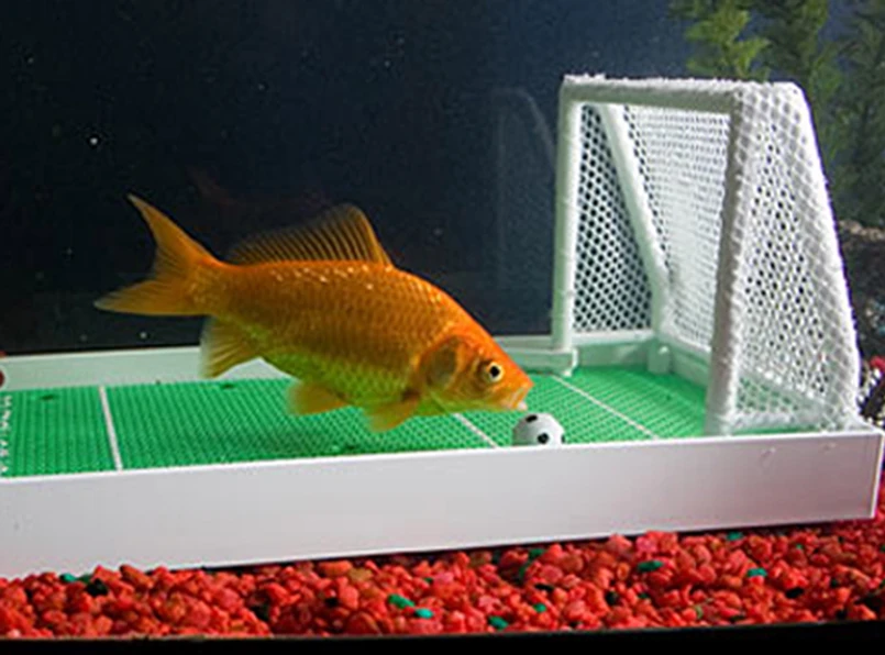 W skład akwariowego kompletu wchodzą: małe boisko z prawdziwą bramką, piłka nożna (a raczej chyba płetwia?) piłka do futbolu amerykańskiego oraz koszykówki, a także tunele, przez które może przepływać rybka. W sumie ok. 20 akcesoriów, dzięki którym nasz podopieczny nie będzie się nigdy nudził. Dowodzi tego najlepiej poniższy filmik udostępniony przez sklep ThinkGeek.