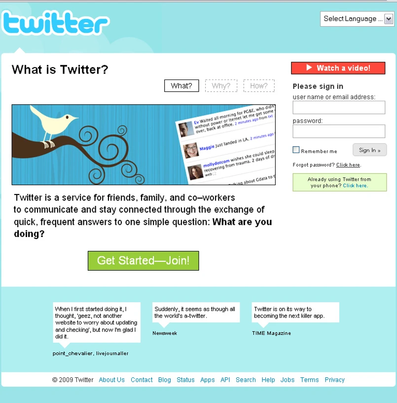 Pomysł na Twittera zrodził się w głowach czterech geeków z Kalifornii: Jacka Dorseya, Noaha Glassa, Biza Stone’a oraz Evana Williamsa (ostatni jest obecnie CEO firmy), pracujących w kompanii produkującej podcasty. Coś, co początkowo miało być internetowym eksperymentem, w sierpniu 2006 r. przerodziło się w pełnoprawny serwis Web 2.0. Koncepcja, na której opiera się Twitter, jest tak prosta, że doprawdy każdy mógłby sobie prawić wyrzuty: dlaczego sam na to nie wpadłem? Wszystko sprowadza się do ciągłego odpowiadania na pytanie: co robię w tej chwili?, generowaniu komunikatów liczących nie więcej niż 140 znaków i zamieszczaniu ich na twitterowej stronie. Nicholas Carr, znany ekspert i publicysta zajmujący się nowymi technologiami, określił Twittera jako "telegram Web 2.0". Oczywiście, są detale (możliwość subskrybowania wiadomości od ulubionych użytkowników, wysyłania zdjęć albo przesyłania postów z telefonu komórkowego), ale to nie one decydują o sukcesie strony. Zgodnie z zasadą "im prościej, tym lepiej" Twitterowi nadano bardzo uproszczoną formę. I jak się okazało - był to strzał w dziesiątkę.