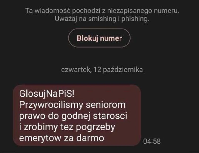 Minister cyfryzacji powiedział PAP, że wczoraj między godz. 4 a 9 rano z jednej z firm, która zajmuje się wysyłką smsów marketingowych, została zrealizowana wysyłka kilkuset tysięcy smsów. Równolegle trwała kampania w oparciu o fałszywe maile. To są smsy i e-maile, które podszywają się pod kampanię Prawa i Sprawiedliwości - powiedział Cieszyński. Dodał, że fejkowe sms-y przychodziły z różnych numerów telefonów, były też nadpisy sugerujące, kto jest ich nadawcą. W żadnym wypadku nie był to alert RCB - podkreślił minister.
