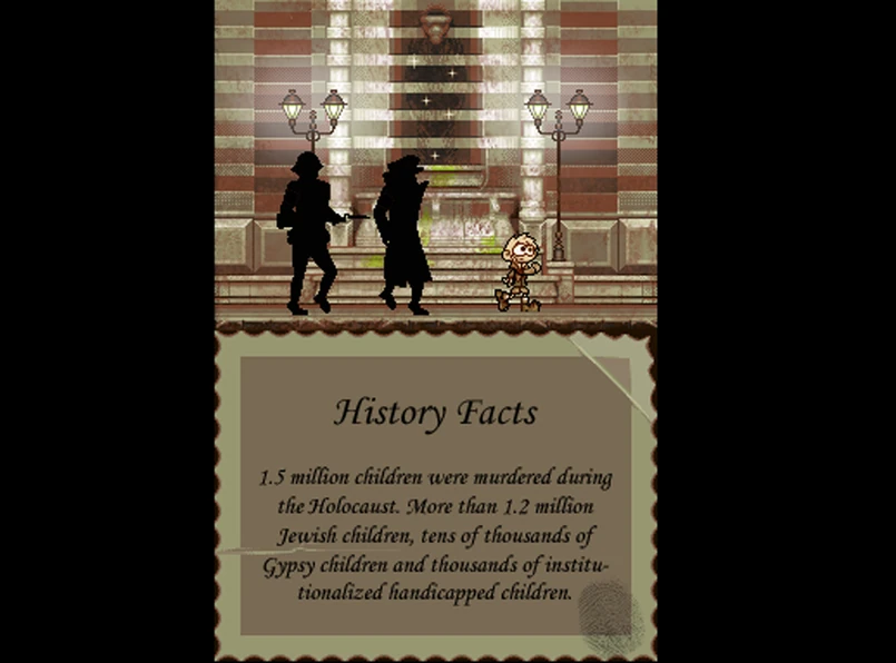 Bohater słyszy na przykład o tym, że w trakcie Holokaustu zamordowano 1,5 miliona dzieci: ponad 1,2 miliona z nich było Żydami, dziesiątki tysięcy - Cyganami, a reszta - niepełnosprawna. Inna notka mówi, że nazistowscy lekarze w obozach zagłady torturowali dzieci, poddając je operacjom bez użycia znieczulenia czy narkozy, zarażając śmiertelnymi chorobami, usuwając narządy wewnętrzne, albo zmieniając im sztucznie płeć. Ofiary później zabijali naziści