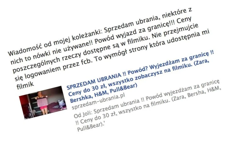 Działanie aplikacji jest bardzo proste i niestety często spotykanie na Facebooku. Przeglądając swoją tablicę, użytkownik dostrzega atrakcyjny link zamieszczony przez znajomego: ktoś chce szybko sprzedać ubrania. Obiecuje niskie ceny i tłumaczy się, że powód to wyjazd za granicę.