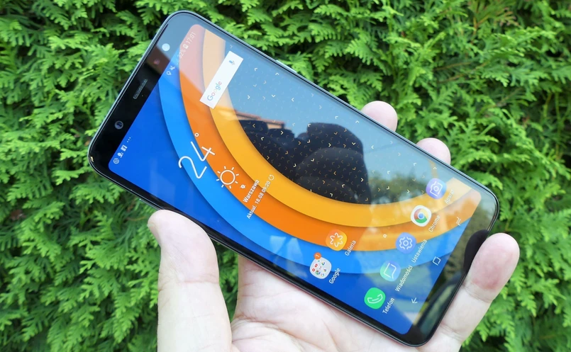 … skupmy się na pozytywach tego telefonu. Bo do tych z pewnością należy zaliczyć jego konstrukcję. Przede wszystkim A6 Plus ma metalowy tył, co dla mnie jest ogromną zaletą. Męczą mnie już bowiem smartfony szklane i śliskie, stawiające na efektowny wygląd kosztem wygody użytkownika. Tu nasz komfort jest na pierwszym miejscu, z racji budowy spokojnie możemy też sobie odpuścić pakowanie urządzenia w jakieś etui. Telefon jest spory (160.2 mm wysokości, 75.7 mm szerokości i 7.9 mm grubości) i dla kogoś o mniejszych dłoniach może być za duży, ale dla nich Samsung przygotował model A6 bez „Plusa”. Dobry wyświetlacz, wykonany w technologii Super AMOLED, ma przekątną 6 cali, rozdzielczość Full HD + i zagęszczenie 411 pixeli na cal. Nie ma też wcięcia, czyli „notcha”, co dla sporej grupy osób będzie wielką zaletą.