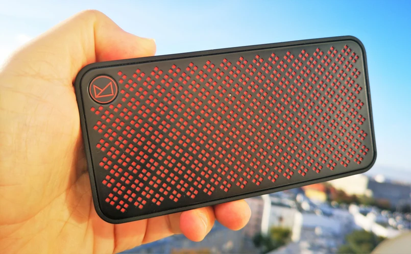 Dlatego właśnie ten głośnik warto mieć zawsze przy sobie, zwłaszcza, że z racji swojej budowy i niewielkich rozmiarów (14 cm długości, 7 cm szerokości 2,5 cm grubości) bez problemu wsuniemy go do kieszeni spodni, kurtki czy do plecaka. Prostokątny, płaski kształt gwarantuje zaś jego trwałość – nic się nie urwie ani nie złamie. Boki urządzenia są gumowe, tył imituje skórę, a przód – gdzie umieszczone są dwa głośniki, przykrywa trudne do zidentyfikowania tworzywo (dobrej jakości plastik bądź aluminium). Wersje kolorystyczne są dwie: czarno-czerwona albo biało-zielona.