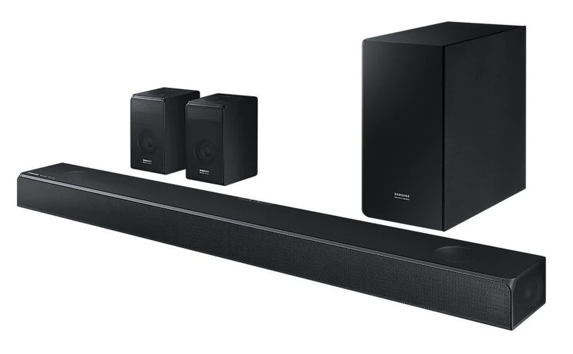 Belka głośnikowa, przygotowana przez fachowców z Samsunga i testowana przez ekspertów Harman Kardon ma wbudowane 10 głośników przednich o mocy 18W każdy, do tego dostajemy – by odpowiednio korzystać z systemu Atmos – dwa głośniki boczne oraz dwa górne.
