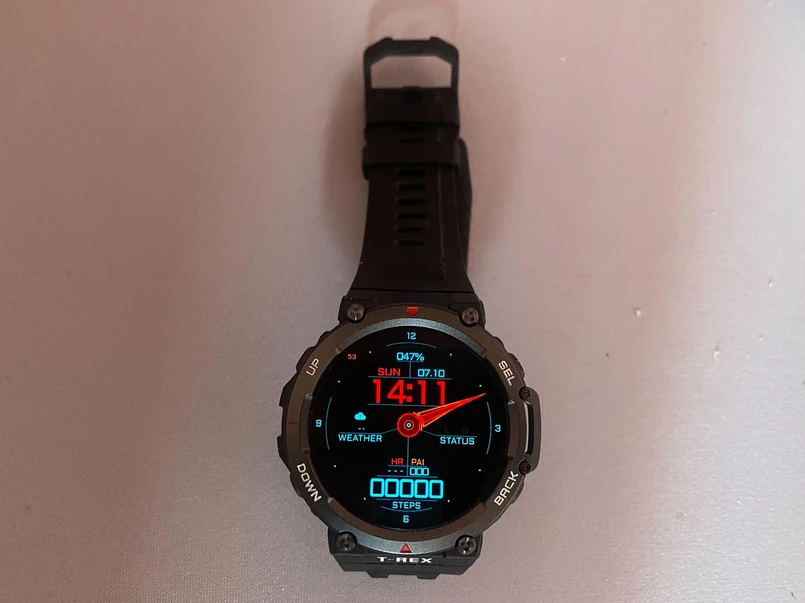 T-Rex 2 wygląda, jak jego nazwa - jest wielki, twardy, odporny i przypomina stare, "pancerne" elektroniczne zegarki. To nie jest eleganckie, life-stylowe urządzenie, które można założyć do garnituru. T-Rex 2 po prostu "krzyczy" swoim wyglądem, że jest urządzeniem, które trzeba zabrać w plener. Zegarek ma działać od -30 stopni Celsjusza do +85C. T-Rex 2 został też wyposażony w duży, kolorowy, dotykowy wyświetlacz AMOLED o rozdzielczości 454x454 i średnicy 1,39 cala. Tarcze możemy zmieniać, korzystając z apki na telefonie, jednak większość z nich jest niestety płatna. Zegarkiem można też sterować za pomocą czterech przycisków na obwodzie - pełnia one te same funkcje, co dotyk, jednak działają szybciej i nie trzeba patrzeć na tarczę, by skorzystać z urządzenia.