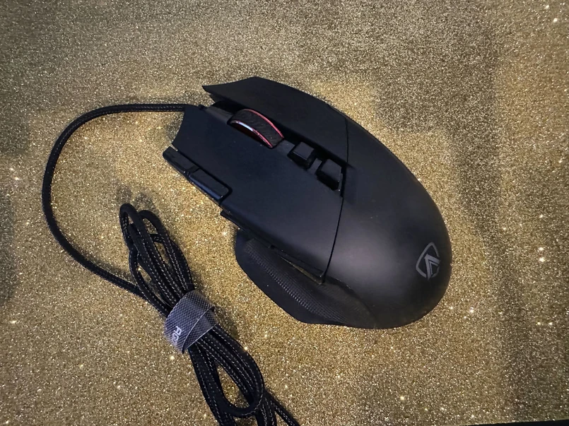 AGM600 to mysz dla graczy praworęcznych. Dobrze leży nawet w dużej dłoni, a liczba przycisków robi wrażenie. Gryzonia wykonano z plastiku dobrej jakości, po bokach tworzywo jest nawet lekko teksturowane, by mysz nie ślizgała się w dłoni. Dostajemy, oprócz głównych przycisków, pięć bocznych klawiszy, wciskaną rolkę i dwa przyciski do kontroli DPI. Gryzoń jest lekko podświetlone logo firmy na grzbiecie oraz cienki pasek LED RGB na dole. Za to rolka jest jedynie pomalowana na czerwono - tam LED nie ma. Co ważne, w pogoni za cięciem kosztów, nie oszczędzano jednak na kablu. Jest on osłonięty plecionką.